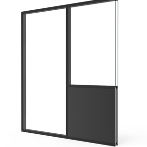 Una solución para la división de espacios interiores, disponible en versión de vidrio o panel, que permite la integración de puertas practicables y venecianas.