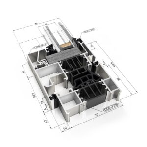 Système de fenêtre et porte-fenêtre de dormant de 70 mm. Sa très puissante capacité d’isolation thermique s’obtient grâce à l’alliance parfaite et à la conception de profilés d’aluminium, de barrettes tubulaires en polyamide de 35 mm, de joints d’étanchéité tubulaires en E.P.D.M. et d’un système de mousse de polyoléfine placée autour du cadre du vitrage. Possibilité d’ouvrants et de parcloses droits ou à pan coupé. Sa capacité d’utilisation de vitrages jusqu’à 58 mm lui permet d’obtenir d’excellents résultats en matière acoustique et thermique. Il existe la possibilité d’intégrer des accessoires à paumelles cachées.